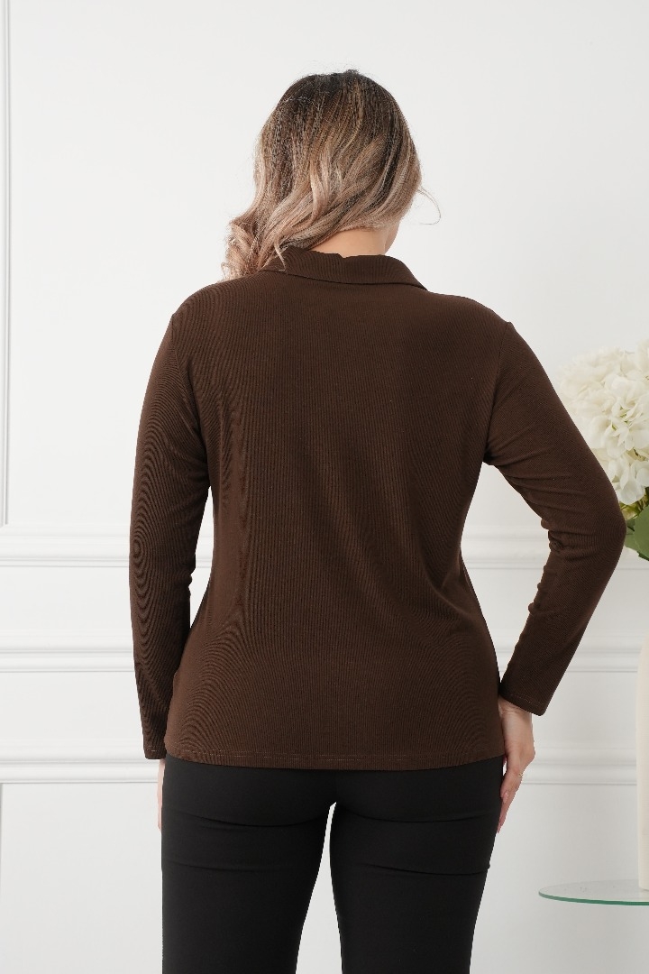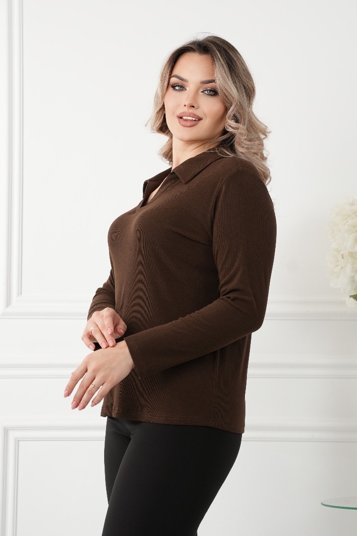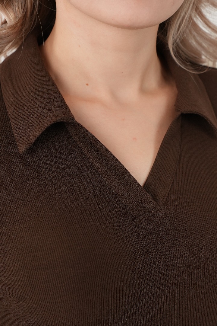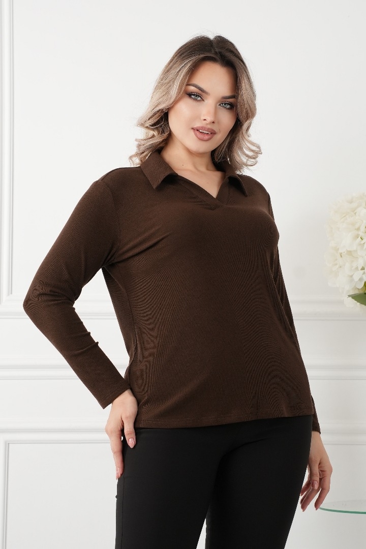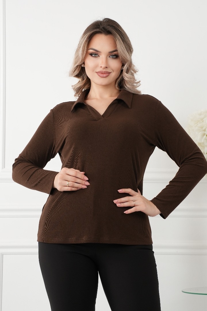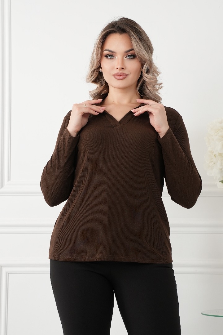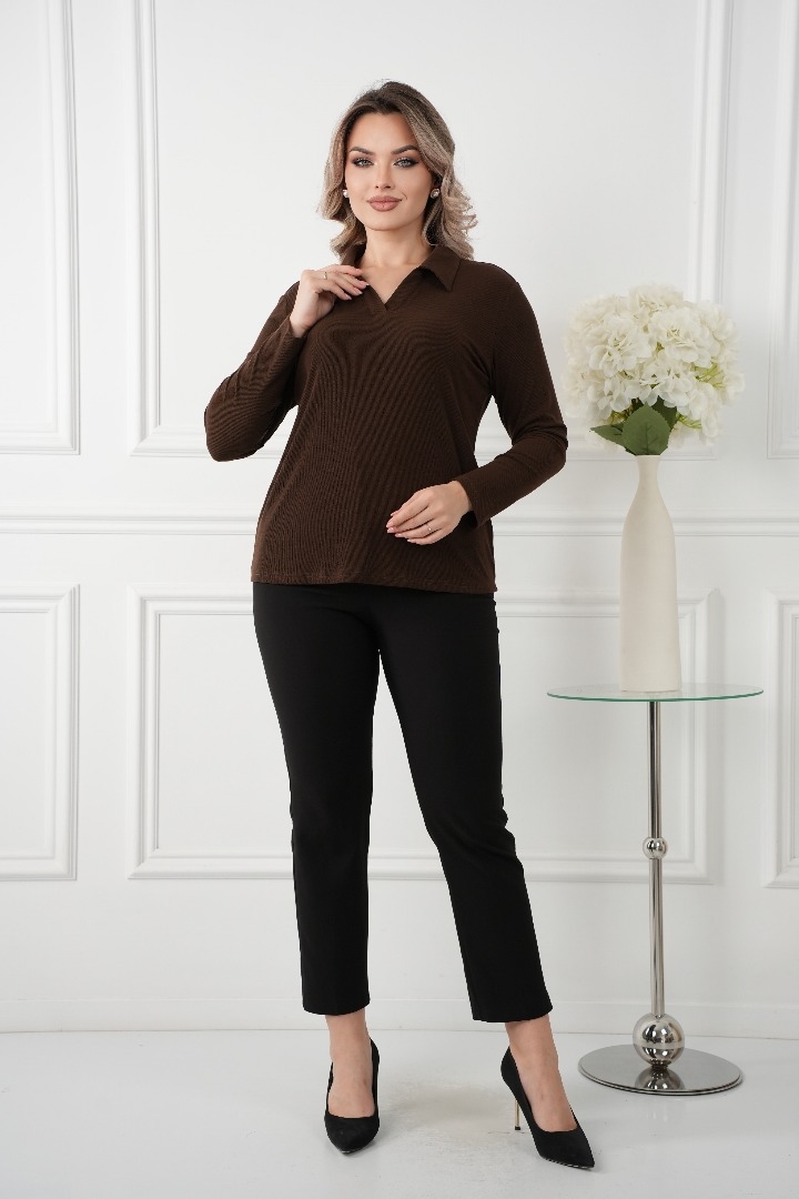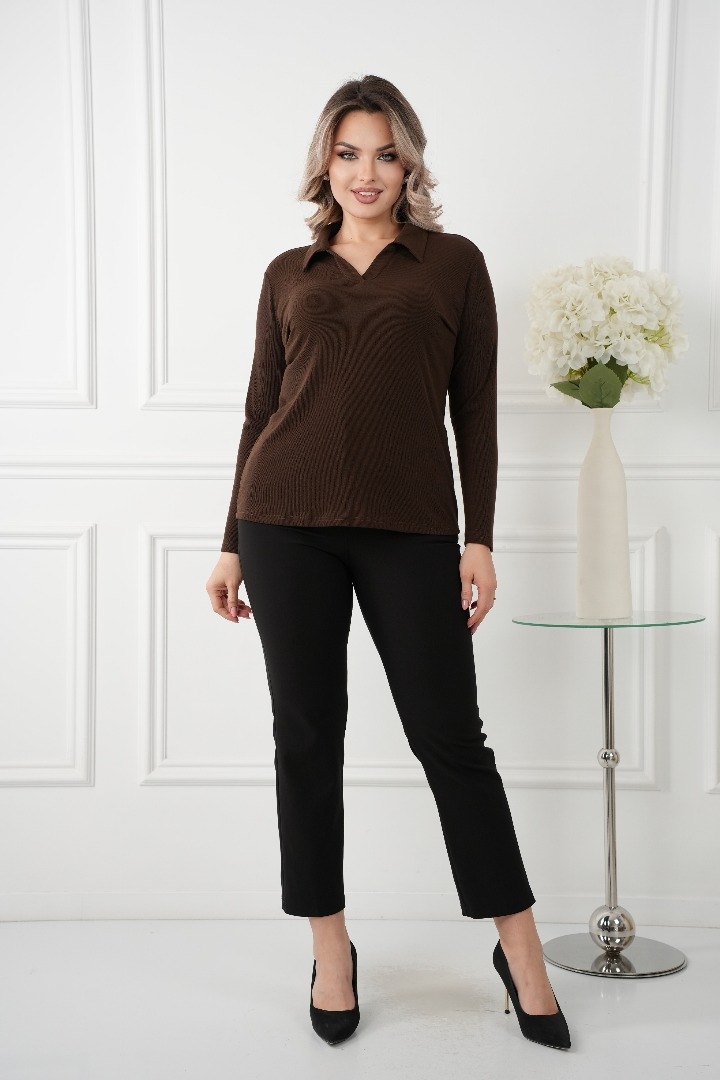 Комфорт и стиль: Изготовленный из мягкого трикотажа с высоким содержанием вискозы с V-образным вырезом и воротником, эта блузка обеспечивает максимальный комфорт в течение всего дня. Ткань обладает отличной эластичностью, что позволяет свободно двигаться и чувствовать себя уверенно.
